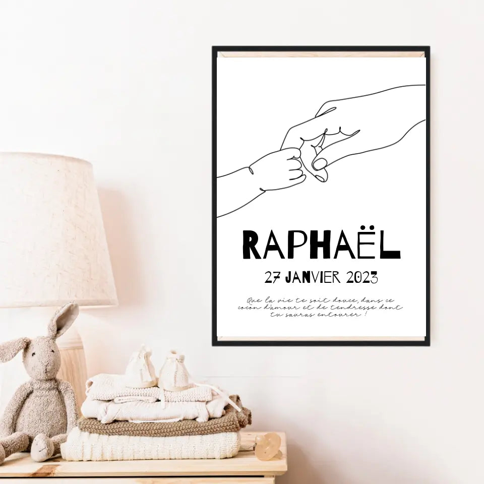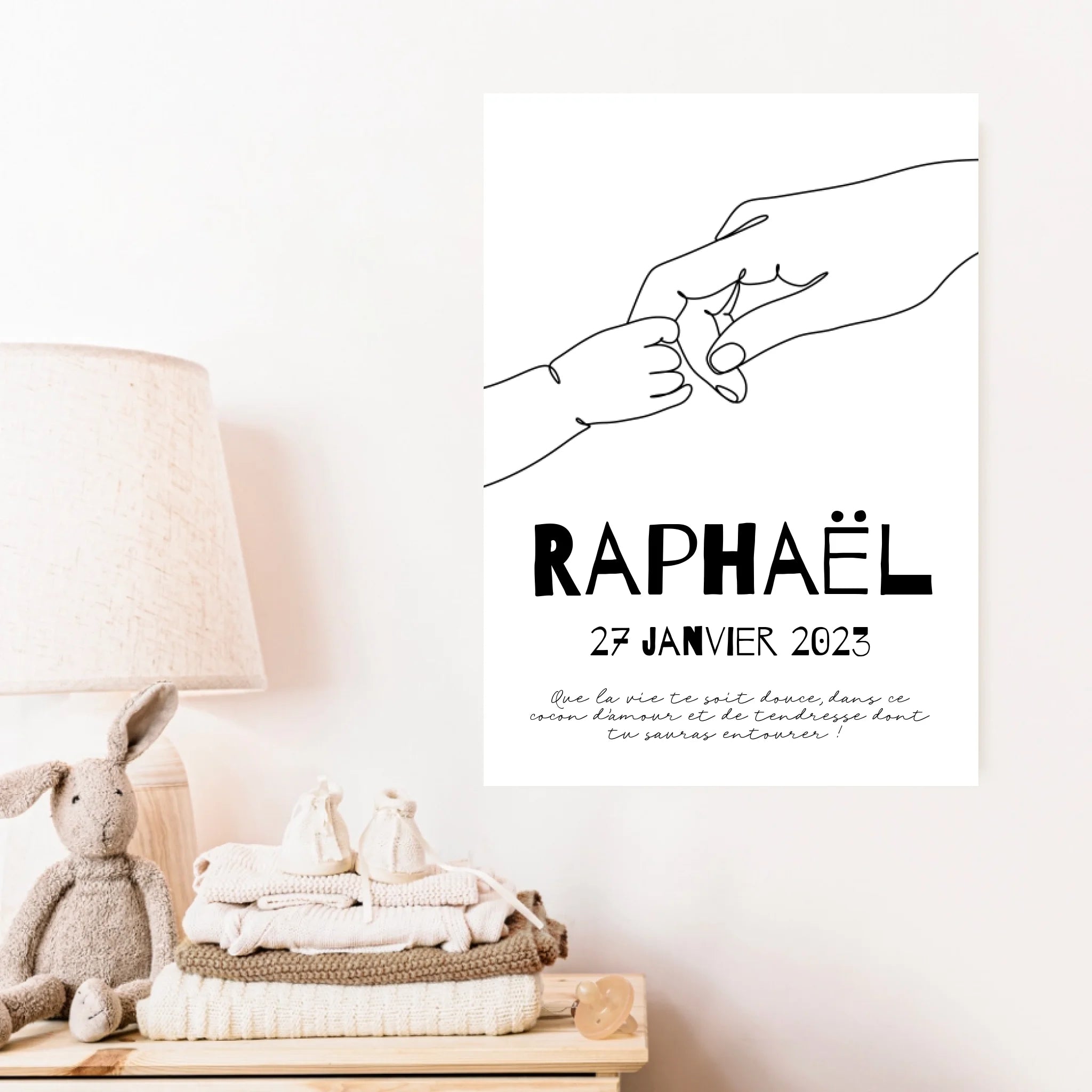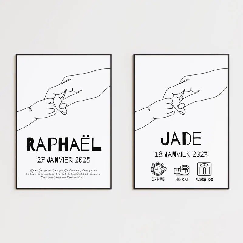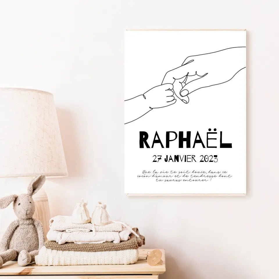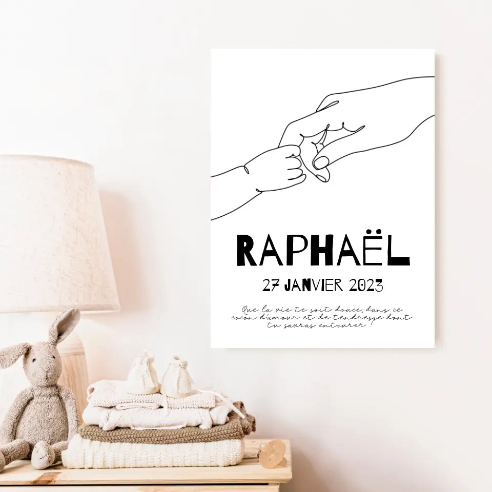 Ce tableau compte aussi une image de deux mains : celle d’une maman et de son enfant. Le tout est fait avec des traits fins et en couleur noir et blanc. C’est l’art moderne dans toute sa splendeur. Et, cette toile noire sur un fond blanc est aussi un accessoire de décoration passe-partout. Vous pouvez l’utiliser dans la chambre de votre princesse ou de votre petit prince. Ce sera le cas, peu importe la thématique de la décoration.