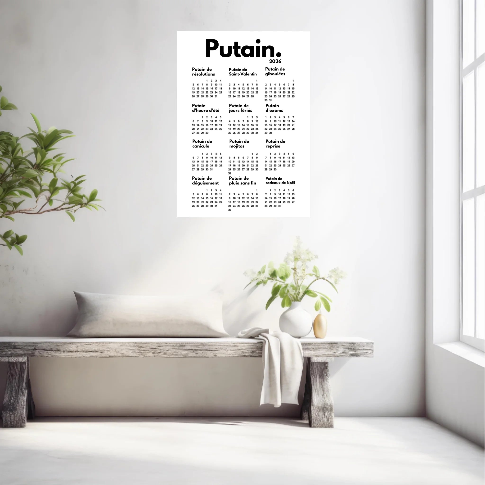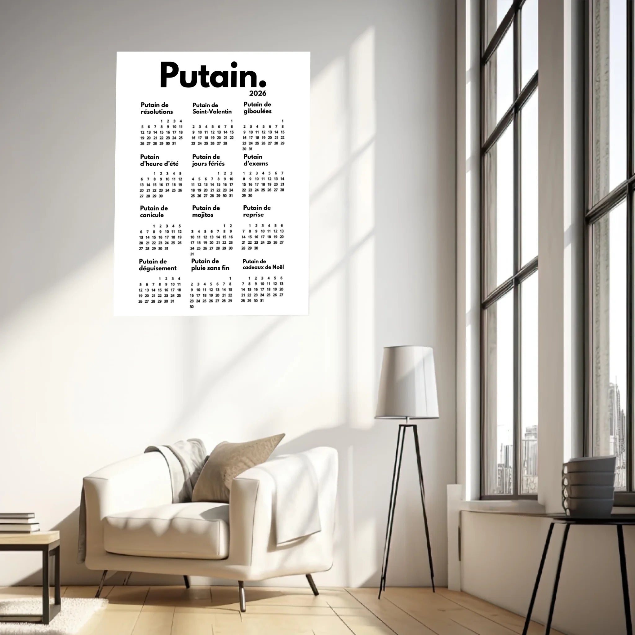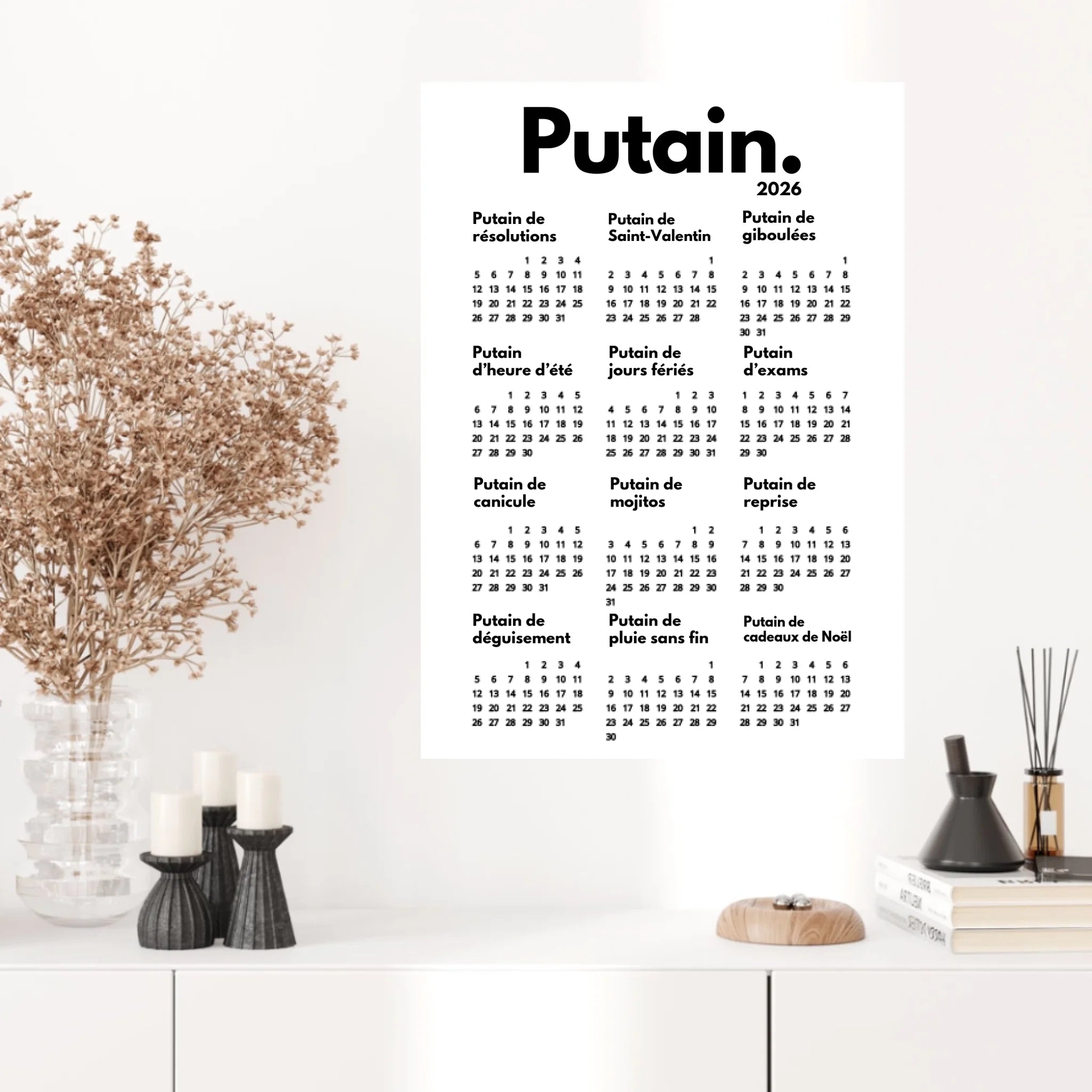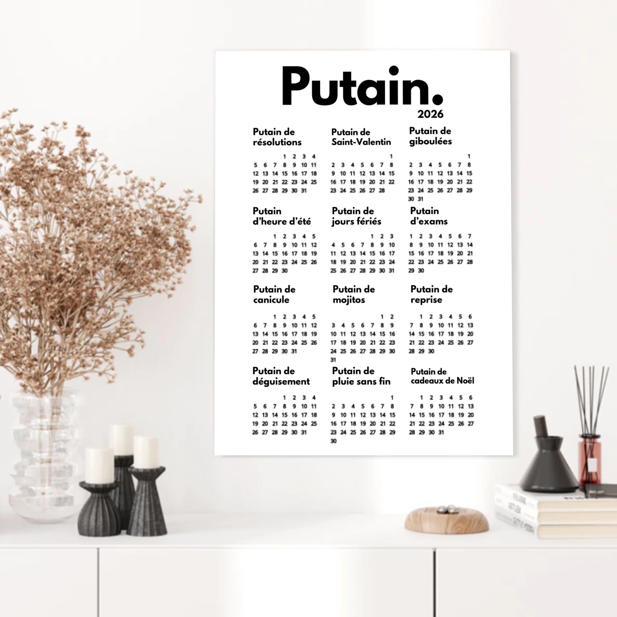 Parce qu’une touche personnelle fait toute la différence, l’Affiche Calendrier Putain 2026 est personnalisable : ajoutez votre prénom, une citation, une couleur préférée ou un message spécial. Idéale pour un intérieur moderne, une cuisine, un bureau ou un espace détente, cette affiche deviendra rapidement la pièce déco qui fait sourire tous vos invités.