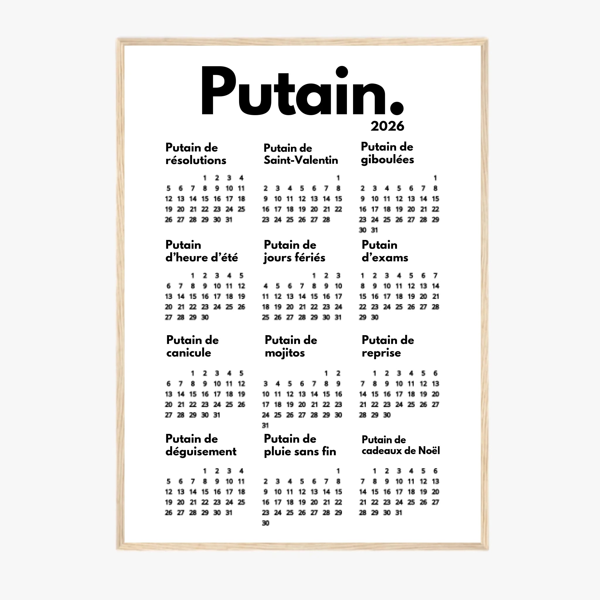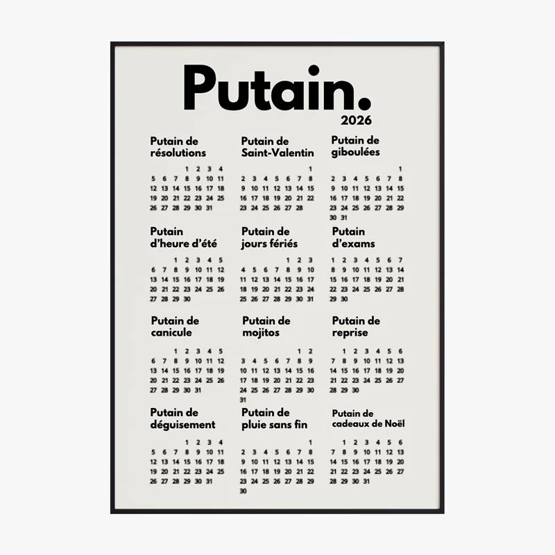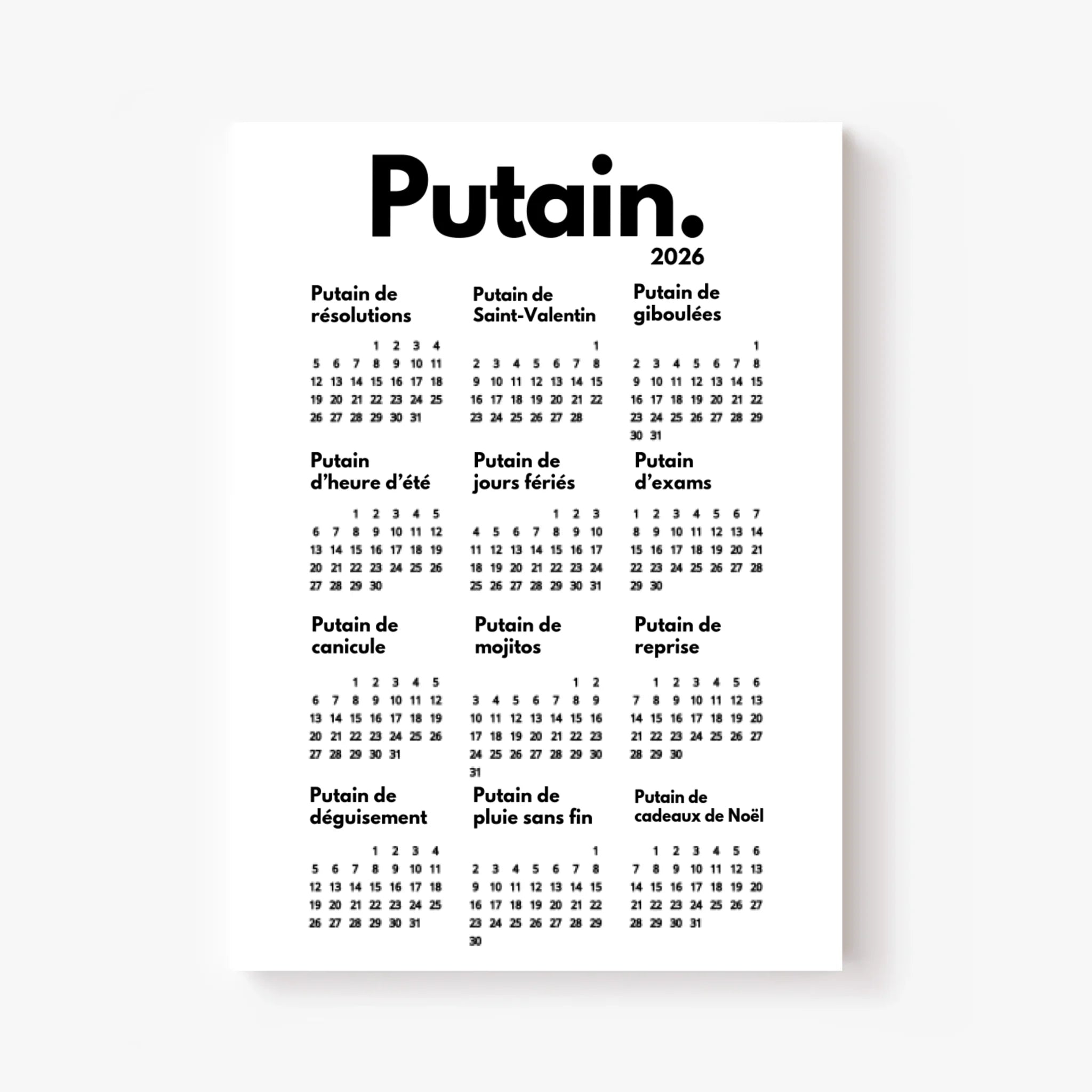 Designé avec soin, le Calendrier Putain 2026 allie typographie moderne, esthétique minimaliste et petite dose de sarcasme bien placée. Chaque mois, une nouvelle phrase “Putain de...” vient refléter avec humour les réalités (et galères) de notre année : de la galette des rois à la canicule, en passant par les bouchons ou les repas de Noël.