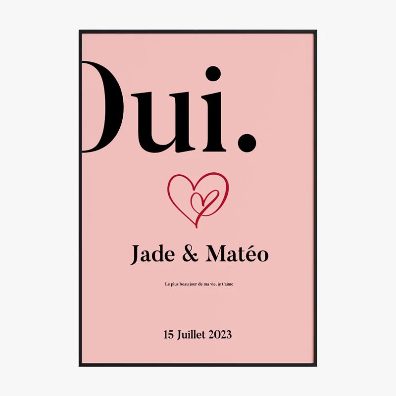 Célébrez l’amour et la plus belle des unions avec notre Affiche Personnalisée Mariage Oui. Une création élégante et romantique, idéale pour immortaliser le jour de votre mariage ou offrir un cadeau inoubliable à un couple. Personnalisez chaque détail : les prénoms, la date, un message spécial, ainsi que les couleurs du texte et du fond pour un rendu parfaitement adapté à votre style.