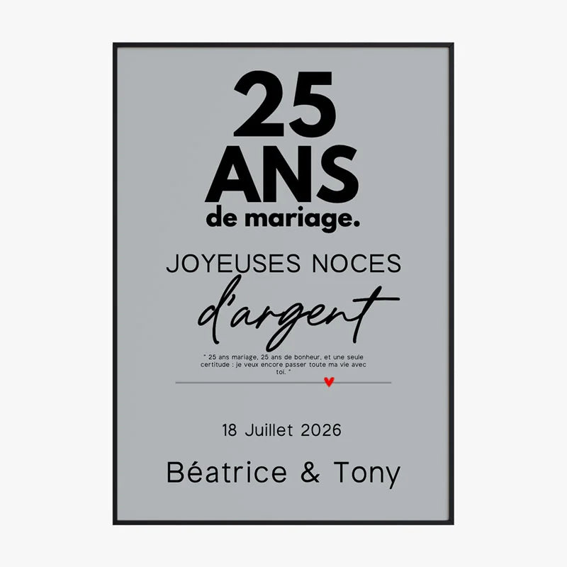 Offrez ou offrez-vous une Affiche Personnalisée Noces d’Argent pour marquer vos 25 ans de mariage avec élégance et émotion. Un cadeau unique et symbolique, parfait pour commémorer une histoire d’amour précieuse.