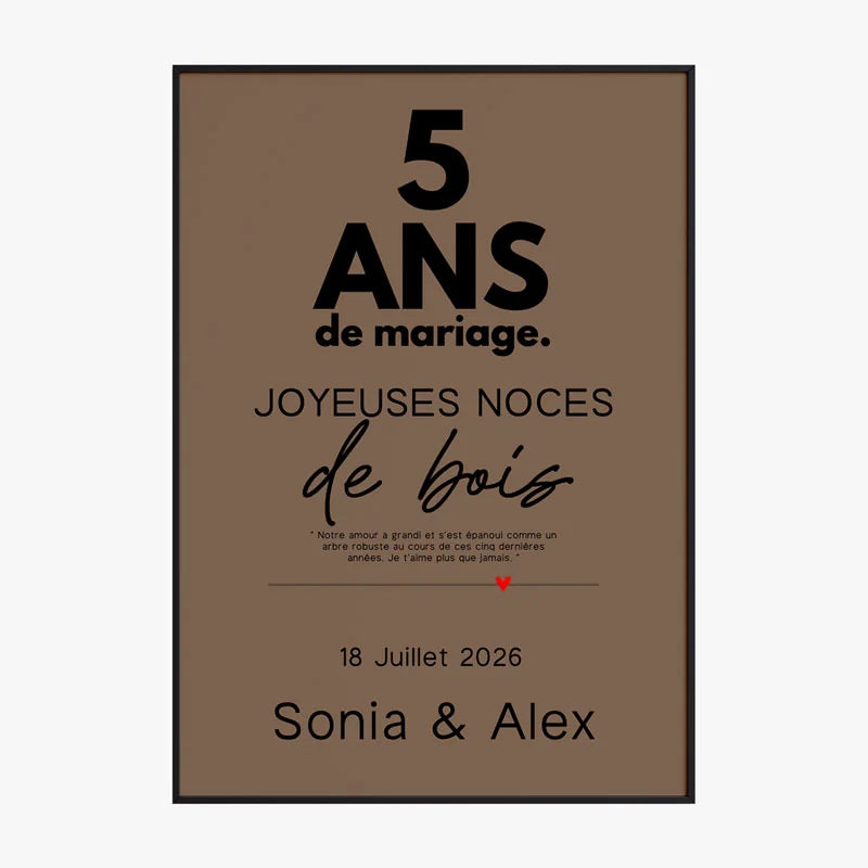 Offrez ou offrez-vous une Affiche Personnalisée Noces de Bois pour marquer vos 5 ans de mariage avec authenticité et élégance. Un cadeau symbolique et durable, parfait pour ce bel anniversaire de couple.
