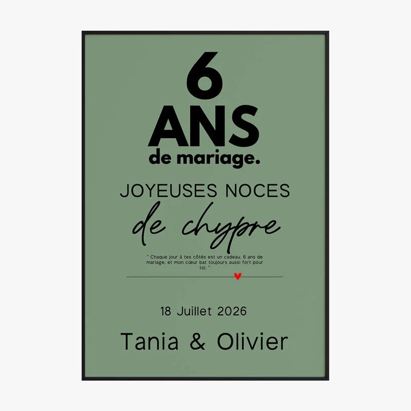 Offrez ou offrez-vous une Affiche Personnalisée Noces de Chypre pour marquer vos 6 ans de mariage avec raffinement et émotion. Un cadeau unique et symbolique, idéal pour célébrer votre belle histoire d’amour.