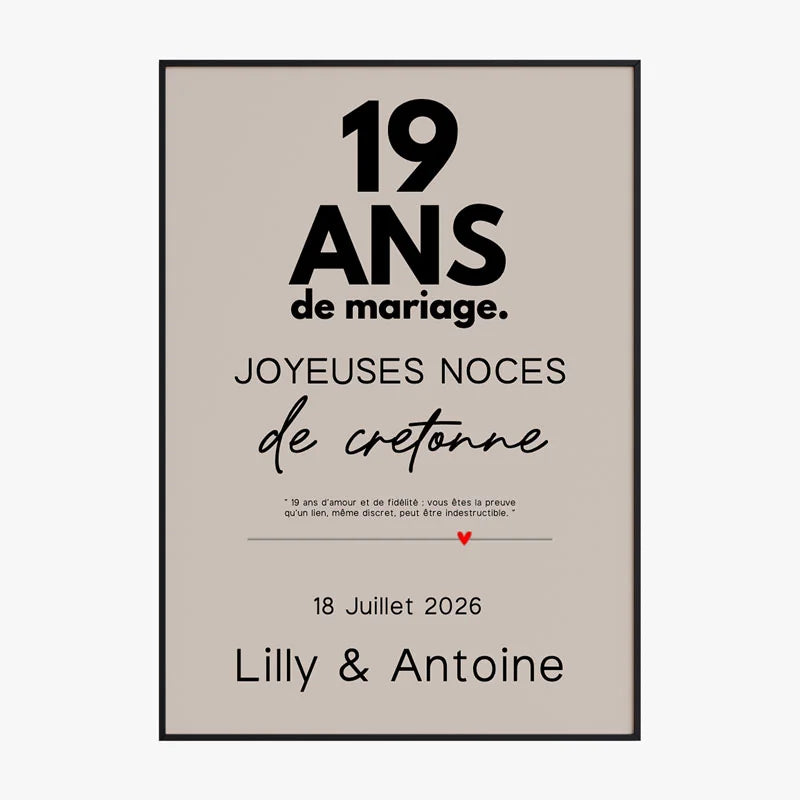 Offrez ou offrez-vous une Affiche Personnalisée Noces de Cretonne pour marquer vos 19 ans de mariage avec émotion et authenticité. Un cadeau unique et symbolique, idéal pour célébrer votre belle histoire d’amour.