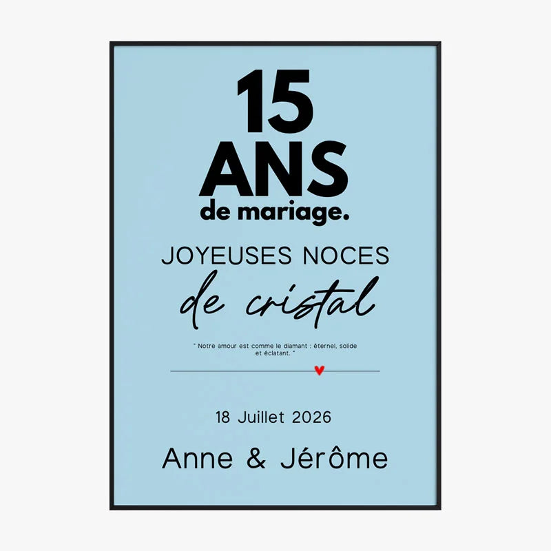 Offrez ou offrez-vous une Affiche Personnalisée Noces de Cristal pour marquer vos 15 ans de mariage avec éclat et émotion. Un cadeau unique et symbolique, idéal pour célébrer votre belle histoire d’amour.