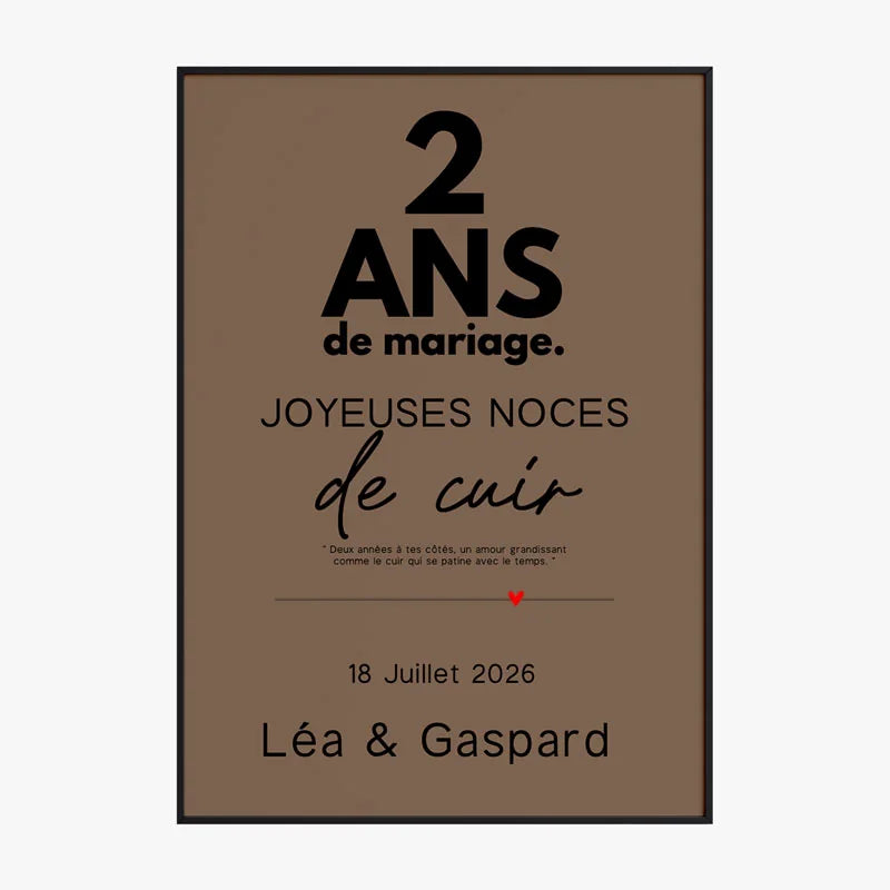 Célébrez vos 2 ans de mariage avec une Affiche Personnalisée Noces de Cuir, symbole de force, de solidité et d’attachement durable. Entièrement personnalisable avec vos prénoms, votre date de mariage, un message unique et les couleurs de fond et du texte de votre choix, cette affiche devient un souvenir intime et raffiné de votre union.