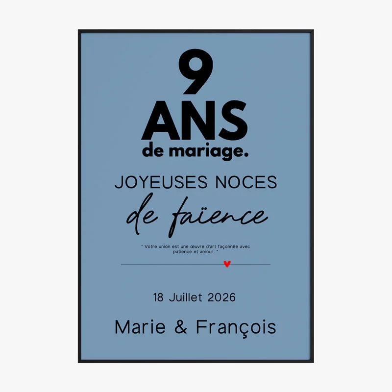 Offrez ou offrez-vous une Affiche Personnalisée Noces de Faïence pour marquer vos 9 ans de mariage avec élégance et émotion. Un cadeau unique et symbolique, idéal pour célébrer votre belle histoire d’amour.