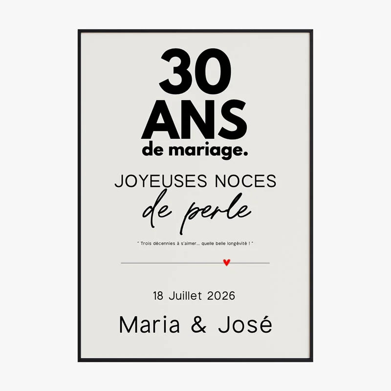 Les noces de perle représentent la pureté, la solidité et la rareté d’un amour qui a su traverser les épreuves et s’épanouir pendant 30 ans. Offrir une affiche personnalisée noces de perle, c’est transformer cette étape importante en un souvenir artistique et intemporel, à contempler chaque jour.