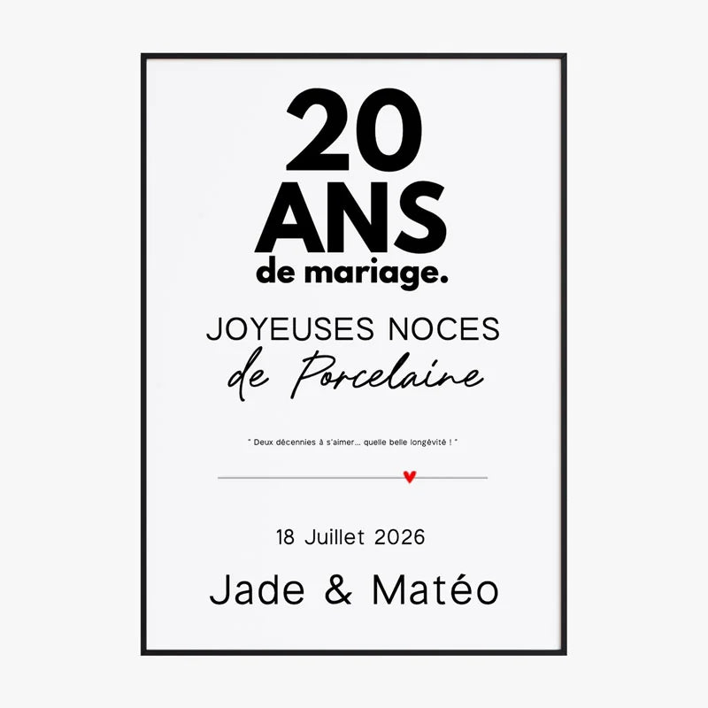 Célébrez vos 20 ans de mariage avec une création unique : l’Affiche Personnalisée Noces de Porcelaine. Élégante et raffinée, elle immortalise deux décennies d’amour et de complicité. Personnalisez chaque détail – prénoms, date, message et même les couleurs – pour créer une décoration murale qui vous ressemble.