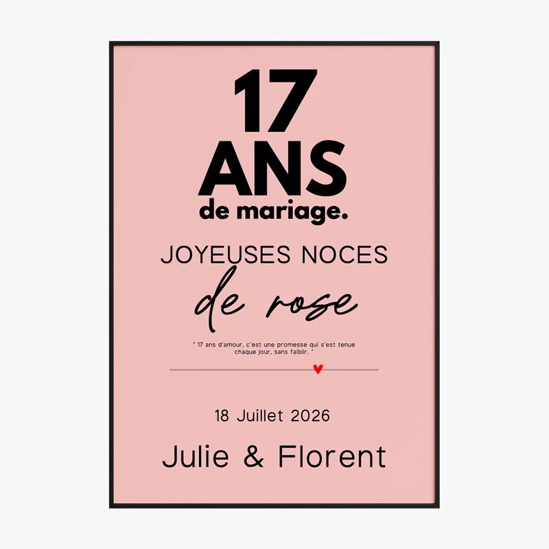 Offrez ou offrez-vous une Affiche Personnalisée Noces de Rose pour marquer vos 17 ans de mariage avec romantisme et élégance. Un cadeau unique et symbolique, idéal pour célébrer votre belle histoire d’amour.
