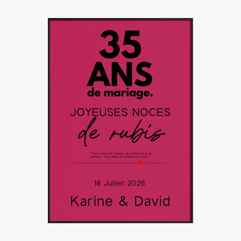Offrez ou offrez-vous une Affiche Personnalisée Noces de Rubis pour immortaliser vos 35 ans de mariage avec élégance et intensité. Un cadeau unique et vibrant, symbole de la passion et de la solidité de votre union.