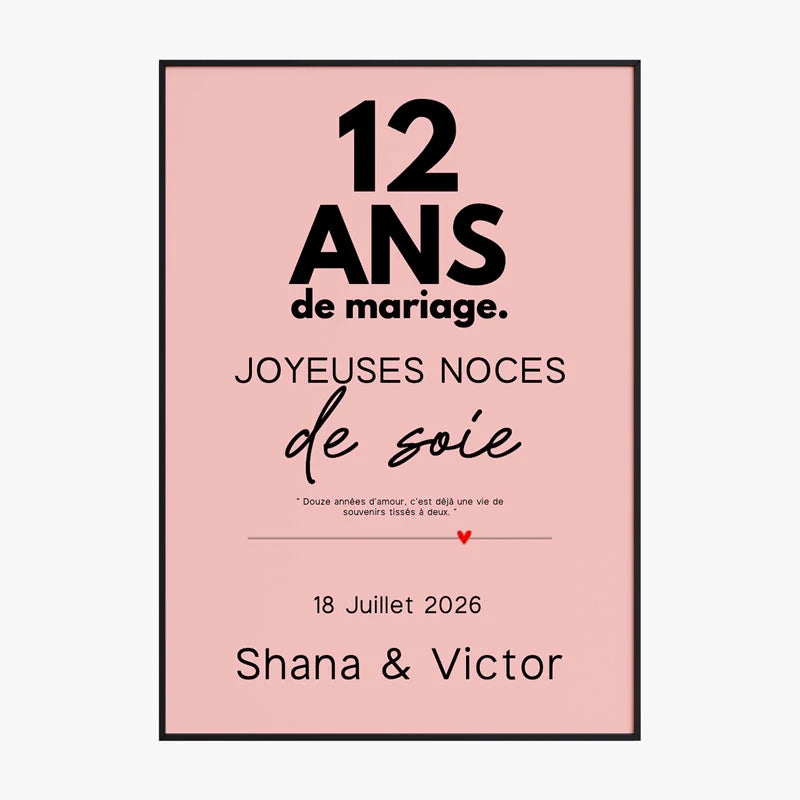 Offrez ou offrez-vous une Affiche Personnalisée Noces de Soie pour marquer vos 12 ans de mariage avec élégance et émotion. Un cadeau unique et symbolique, idéal pour célébrer votre belle histoire d’amour.