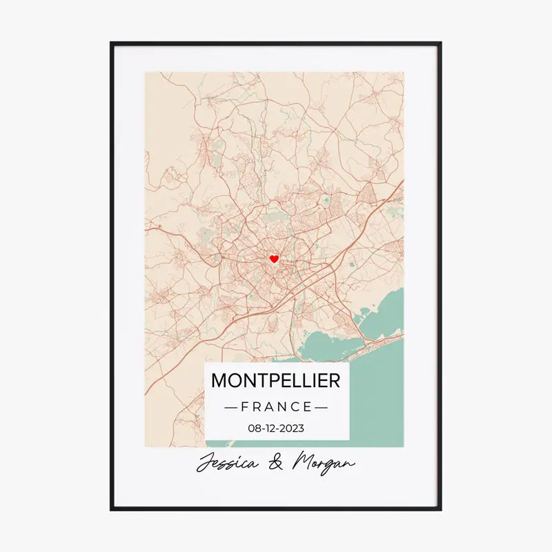 Remplissez soigneusement le formulaire au moment de passer commande. Le tableau zoomera sur la ville. Et, l’adresse exacte de votre rencontre sera marquée par un cœur rouge. Le reste servira de décor au tableau. Vos deux prénoms seront même placés comme des signatures à la base du tableau. De quoi lui apporter une touche chic supplémentaire.